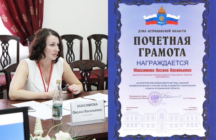 За многолетний добросовестный труд, высокий профессионализм и личный вклад в развитие строительной отрасли Астраханской области награждены почетными грамотами Максимова Оксана Васильевна, директор Астраханского филиала ЗАО ДАР/ВОДГЕО, и Карасюк Владимир Федорович, главный инженер проекта Астраханского филиала ЗАО ДАР/ВОДГЕО.