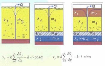 1. Расчеты скоростей фильтрации на основе суперпозиции понижений напоров в результате работы скважин у реки или на удалении при наличии бытового потока использовано