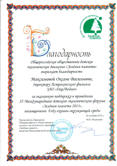 29 октября 2013 г в Астрахани состоялось открытие XI Международного детского экологического Форума «Зеленая планета -2013» с участием представителей из 60 субъектов РФ и 6 стран ближнего зарубежья при поддержке Администрации Президента РФ и с участием Правительства АО.